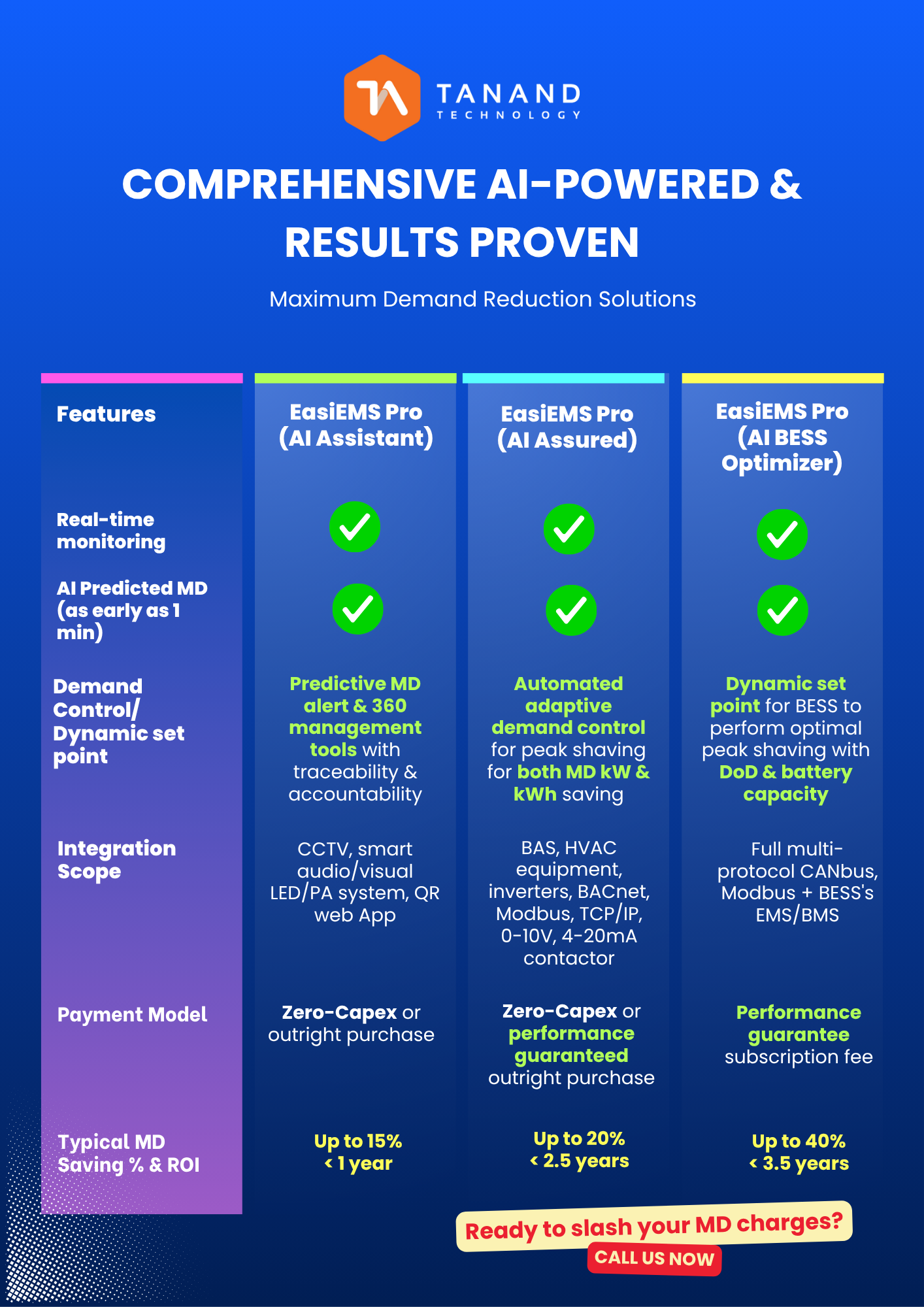 With intelligent peak shifting, you can reduce MD charges by 10% to 20%, depending on load profile. All with monthly, exportable reports, and baseline verification. - Zero-CAPEX Option + ROI Share Model
