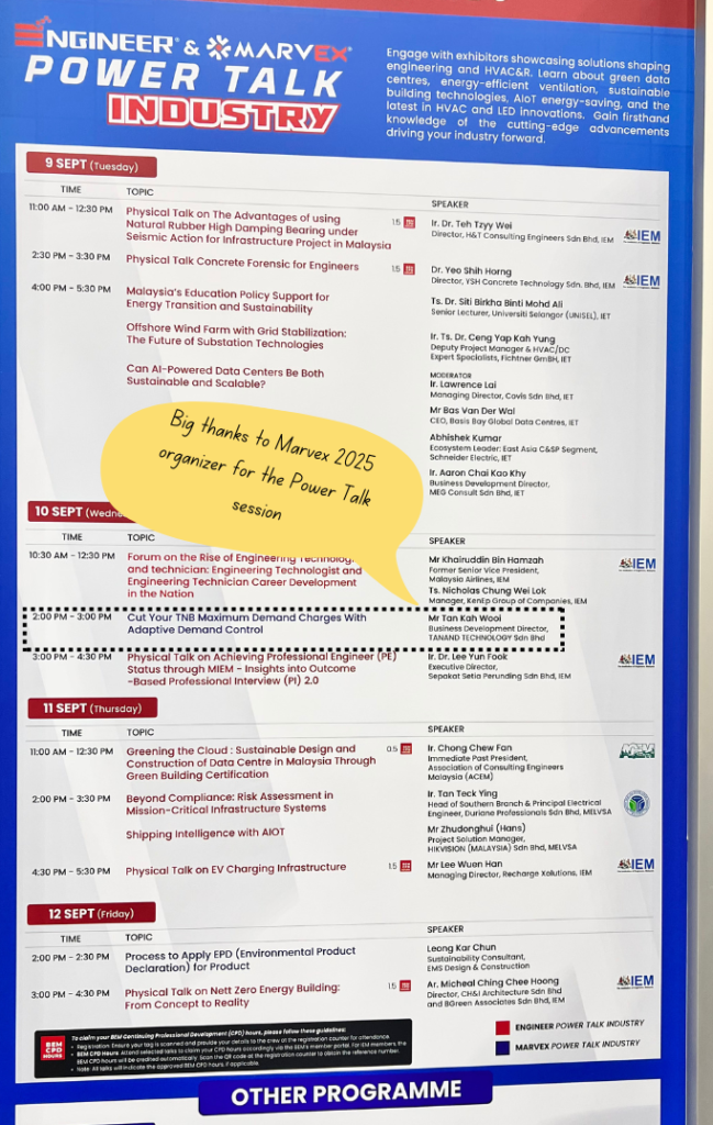 Our session, “Cutting TNB Maximum Demand Charges with Adaptive Demand Control”, highlights how Tanand Technology’s EasiEMS + BESS helps industries achieve smarter energy efficiency, peak shaving, and measurable cost savings.
